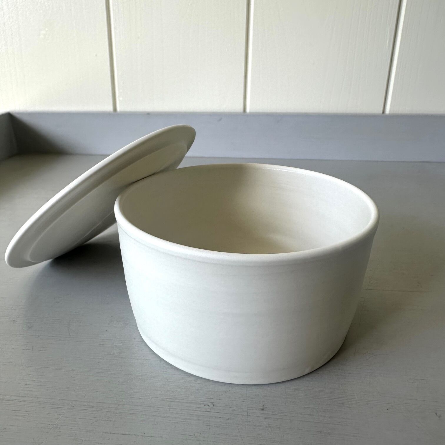 フラットな蓋の付いたキャニスターです。重ねられるので冷蔵庫にコンパクトにおさまります。電子レンジに対応していますので、温め直したりするのにも便利です。磁器なので匂い移りもしません。食洗器にも対応しています。